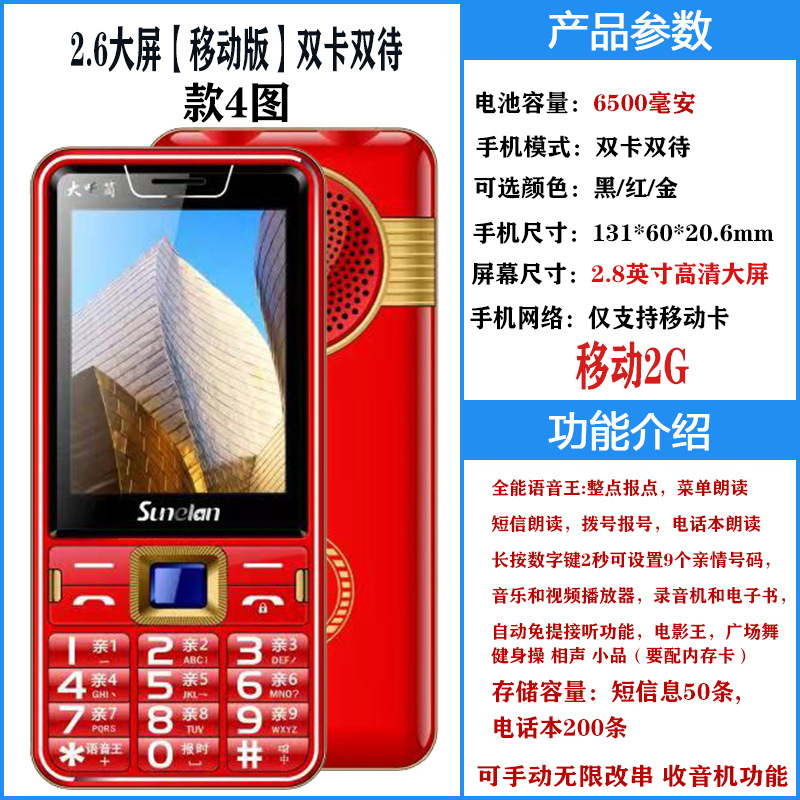 机身颜色2.6大屏【4G全网通】 4200电池 黑色(详情页款1图),2.6大屏【4G全网通】 4200电池 红色 (详情页款1图),2.6大屏【4G全网通】 4200电池 金色 (详情页款1图),2.6大屏【4G全网通】 4200电池 蓝色 (详情页款1图),2.6大屏【移动版】3500电 黑色(详情页款2图),2.6大屏【移动版】3500电 红色(详情页款2图),2.6大屏【移动版】3500电 金色(详情页款2图),2.6大屏【移动版】3500电 蓝色(详情页款2图),2.6大屏【移动版】6800电 黑色(详情页款3图),2.6大屏【移动版】6800电池 红色(详情页款3图),2.6大屏【移动版】6800电池 金色(详情页款3图),2.6大屏【移动版】6800电池 蓝色(详情页款3图),2.8大屏【移动版】6500电池 黑色(详情页款4图),2.8大屏【移动版】6500电池 红色(详情页款4图),2.8大屏【移动版】6500电池 金色(详情页款4图),2.6大屏【电信版】3800电池 黑色(详情页款5图),2.6大屏【电信版】3800电池 红色(详情页款5图),1.8屏【移动版】2600电池 黑色(详情页款6图),1.8屏【移动版】2600电池 红色(详情页款6图),1.8屏【移动版】2500电池 红色,1.8屏【移动版】2500电池 粉色